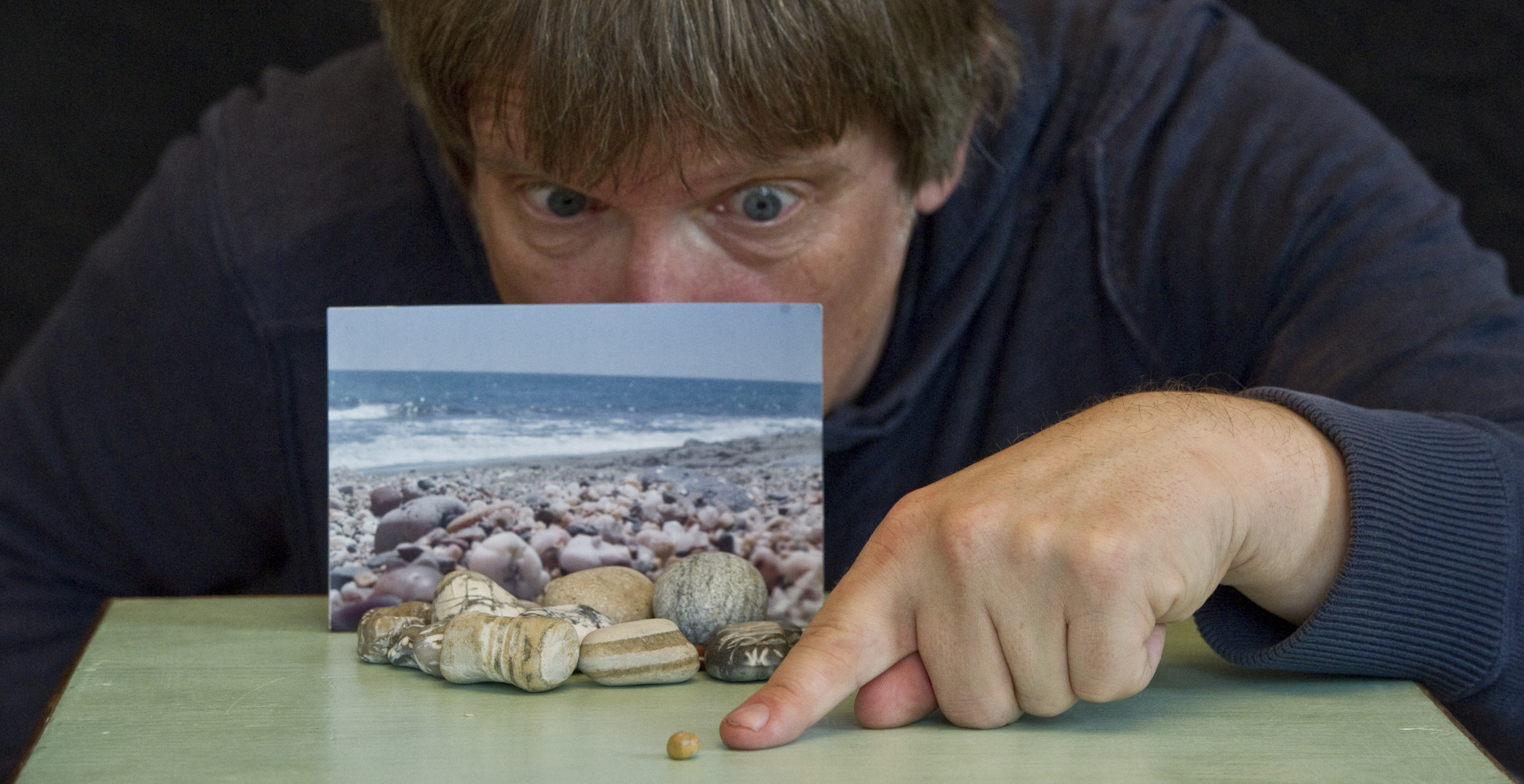 "Auf einem kleinen Tisch entstehen mit kleinen Objekten wie Steinen, Postkarten oder Spielzeughäuschen Geschichten darüber, wie schön es in der Welt sein kann, voller Wärme, Humor und Konzentration, die das Publikum in den Bann ziehen." Die deutsche Bühne